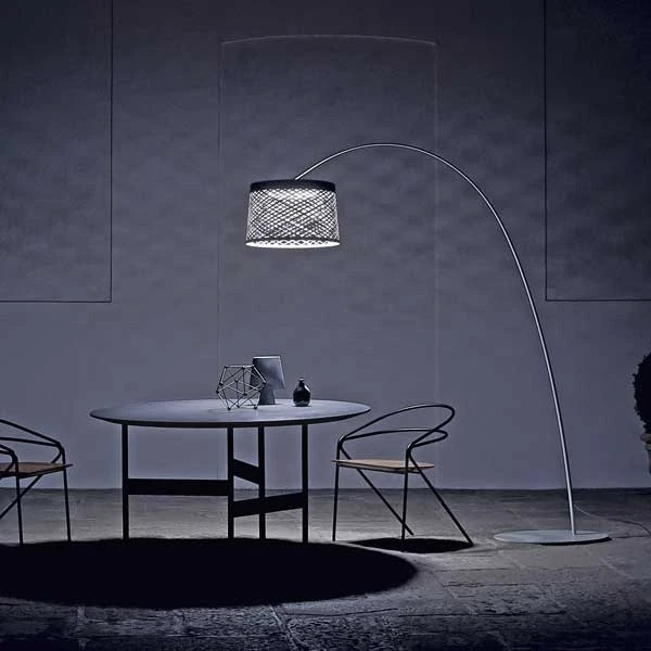 The outdoors Twiggy Grid Floor lamp is a lighting icon. The design is inspired by a picture of a curved fishing rod. Like the rod Twiggy Grid is supremely flexible and strong; features that are combined with clarity and light in the creation of a breathtaking luminous object. This new outdoor model brings Twiggy back to the wide open outdoor spaces. The shade has been altered to a woven surface which allows you to shade the intensity of the light source while creating sense of connection between the lamp and the surrounding shapes and materials thus honouring both function and aesthetics.