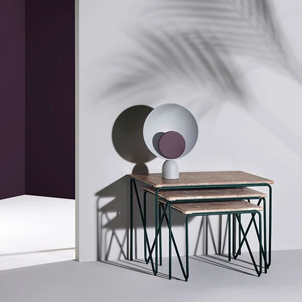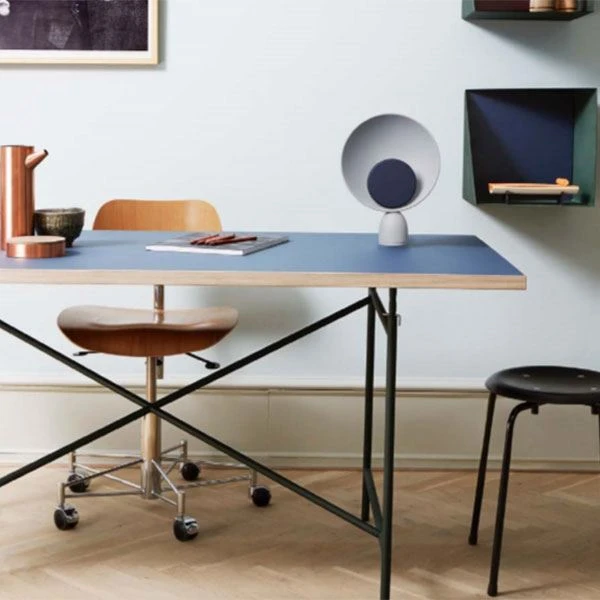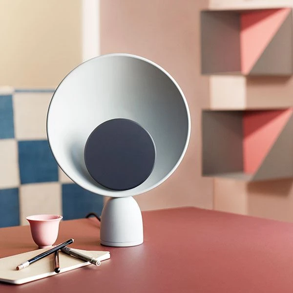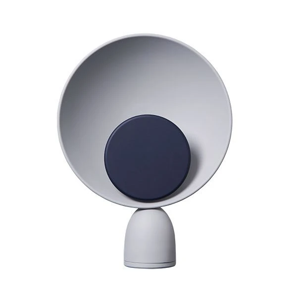 Blooper Table Lamp s a simple and geometrically designed lamp. Behind the coloured disc is a little LED that reflects nice and comfortable light from the sides of the lamp. By turning the disc you can turn on, dim, and turn off the light.The disc is actually a magnet, so you are able to change the colour and look of the lamp, if you feel like it. The discs come in three different colours; Grey, NavyBlue, and Purple.